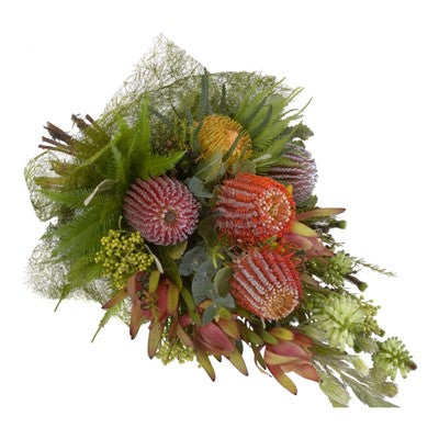 The exquisite bouquet of Australian native flowers made of proteas, banksias, silvan red, wrapped up in high quality paper and ribbon. The colour is toned contrasting and combined with all long-lasting variety. It definitely lasts for a week and more with proper care. Flowers are guaranteed ifor same day delivery with all orders received before 1PM